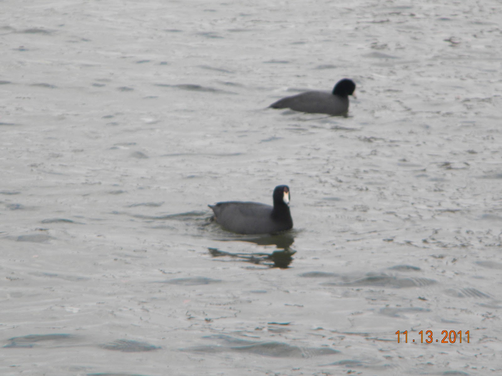 Coots.. looks like a duck, but isn't.  Doesn't have webbed feet, so has a hard time taking off and landing in the water.  They flap their wings like the crazy, trying to run on the water and finally get airborne.  They only get about 2 feet off the water.  when they stop flapping their wings they don't glide like most birds, they just drop like a rock.